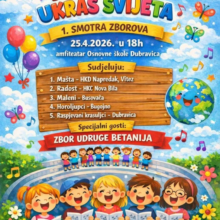 S velikim veseljem najavljujemo nastup Napretkovog dječjeg zbora „Mašta“ na 1. smotri dječjih zborova pod nazivom ” Djeca su ukras svijeta”