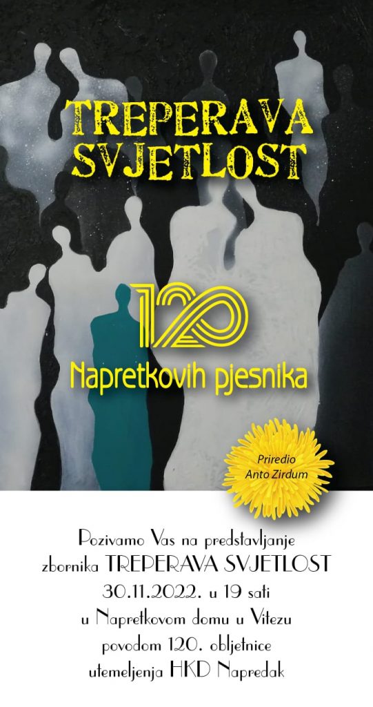 U srijedu, 30.11. 2022. s početkom u 19,00 sati u Napretkovom domu u Vitezu bit će održano prvo predstavljanje zbornika Treperava svjetlost– 120 Napretkovih pjesnika.
