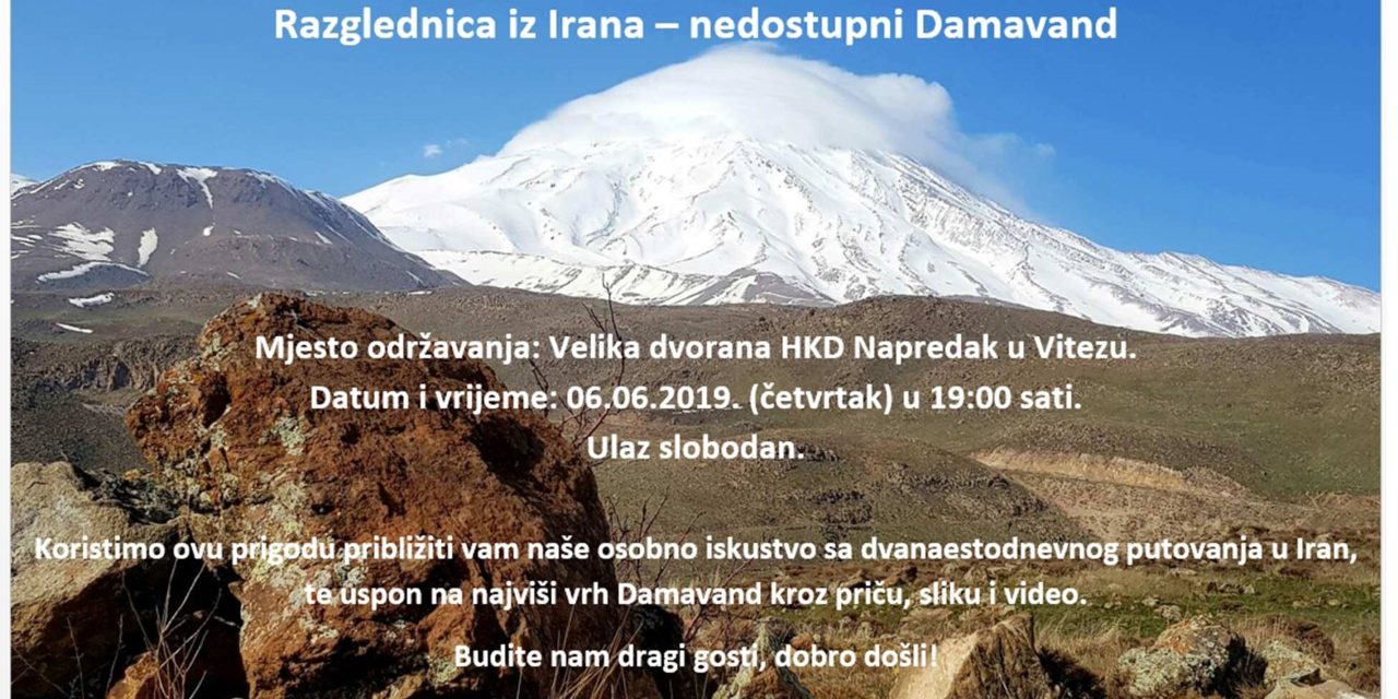Članovi ekpedicije Damavand 2019. prenijet će vam videom, fotografijom i riječju osobna iskustva s dvanaestodnevnog putovanja u Iran i uspona na najviši vrh Damavand (5671 m n/v).
